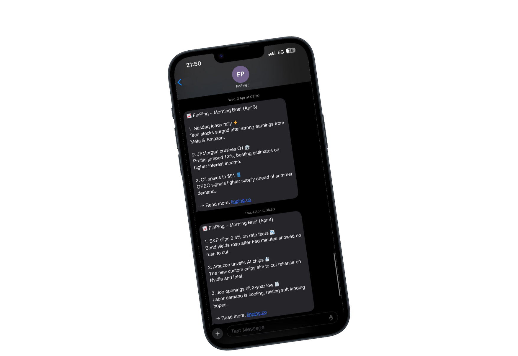 FinPing filters the finance noise. You get the top 3 market-moving headlines, every weekday—texted by 8:00am. No inbox. No distractions. Just signal.