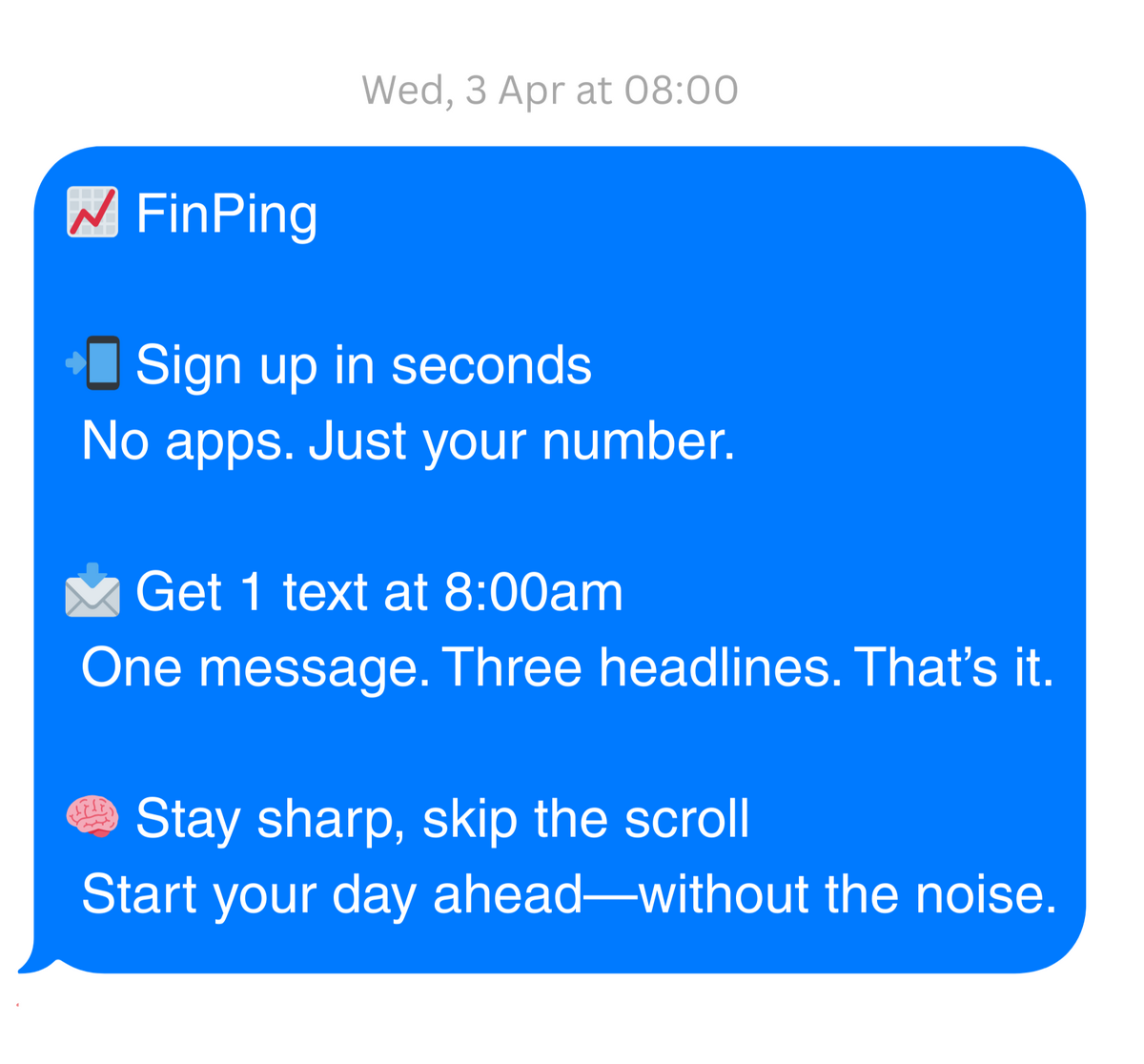 FinPing filters the finance noise. You get the top 3 market-moving headlines, every weekday—texted by 8:00am. No inbox. No distractions. Just signal.